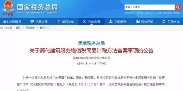 为进一步深化税务系统“放管服”改革,简化办税流程,根据《国家税务总局关于进一步深化税务系统“放管服”改革 优化税收环境的若干意见》(税总发〔2017〕101号)要求,现就建筑服务增值税简易计税方法备案事项公告如下: