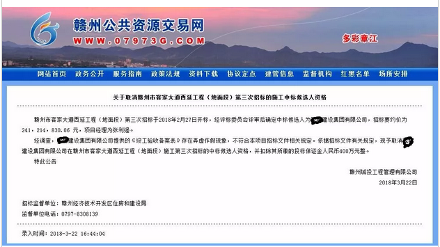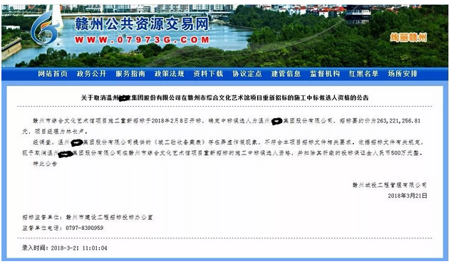 3月21日、22日,赣州市接连取消2个工程项目的施工中标候选人资格,并扣除其所缴的投标保证金人民币共计900万元整。