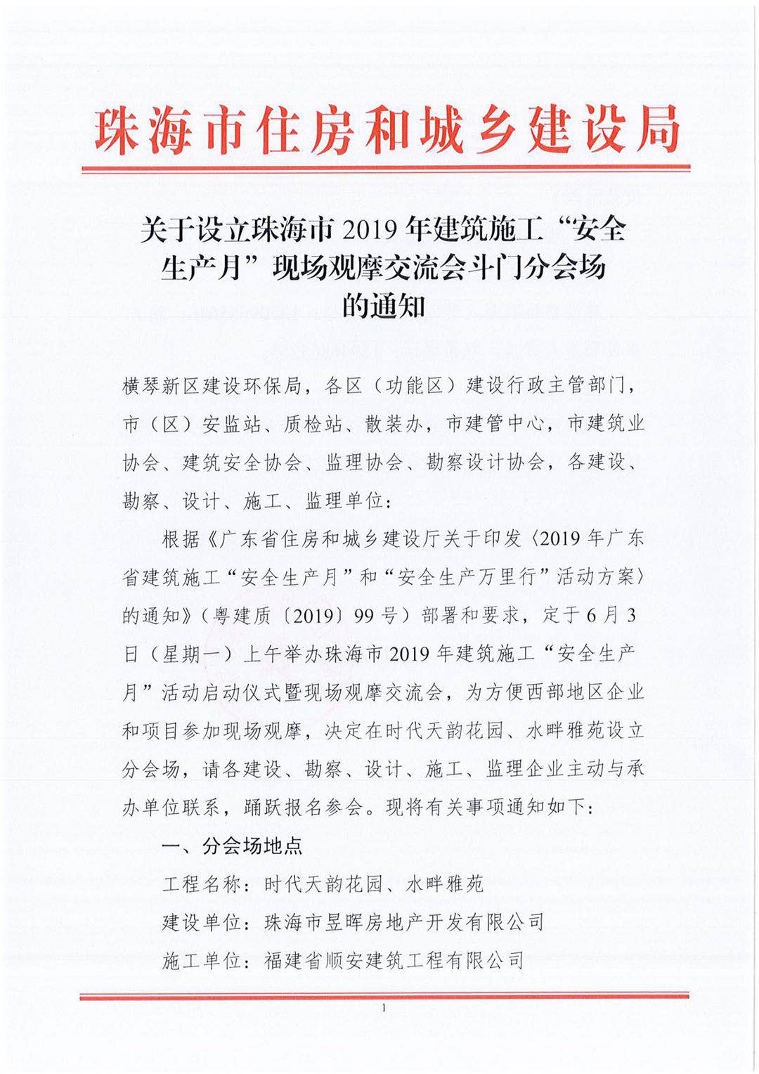 关于设立珠海市2019年建筑施工“安全生产月”现场观摩交流会斗门分会场的通知
